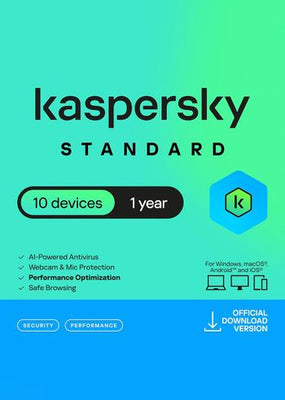 Kaspersky Standard (1 Year / 10 Devices) Key valid for the United Kingdom / Ireland — typically a digital activation key you redeem via your Kaspersky account or official app: